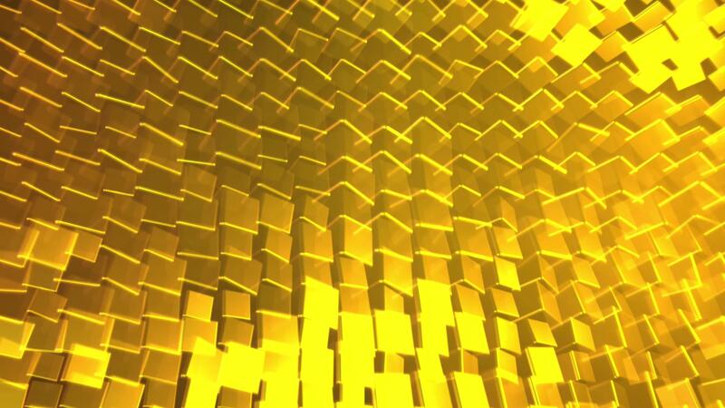 Abstract 3d geometric shapes in rows spinning on golden background, seamless loop. Animation. Small yellow cubes rotating endlessly in different directions. Pro Video