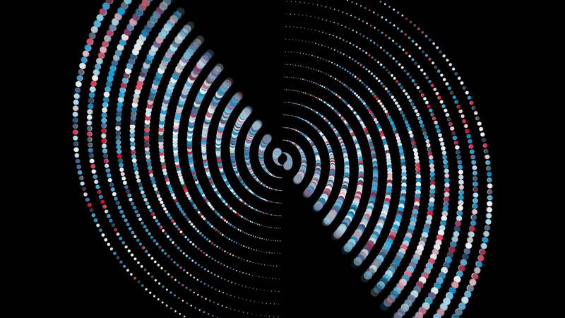 Abstract rows of small circles rotating fast and becoming giant 3D columns on black background. Animation. Psychedelic background with spinning volume shapes. Pro Video