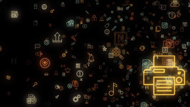 For editorial use only. Abstract multimedia background made by different images of icons used in the internet. Animation. Flying social media logos and signs, seamless loop. Pro Video