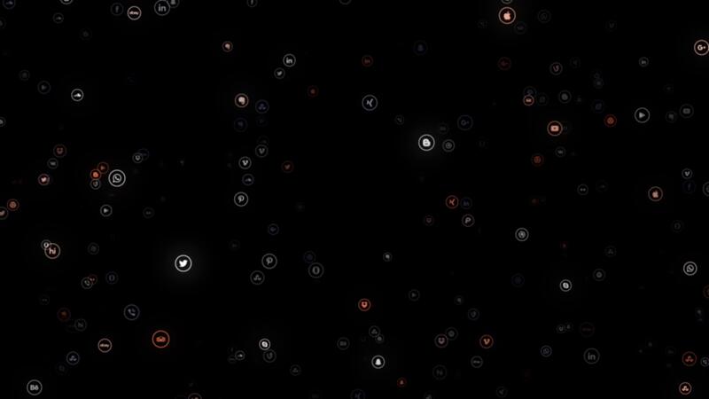 For editorial use only. Abstract colourful popular social media icons flowing towards the camera on black background, seamless loop. Animation. Different social net logos. Pro Video