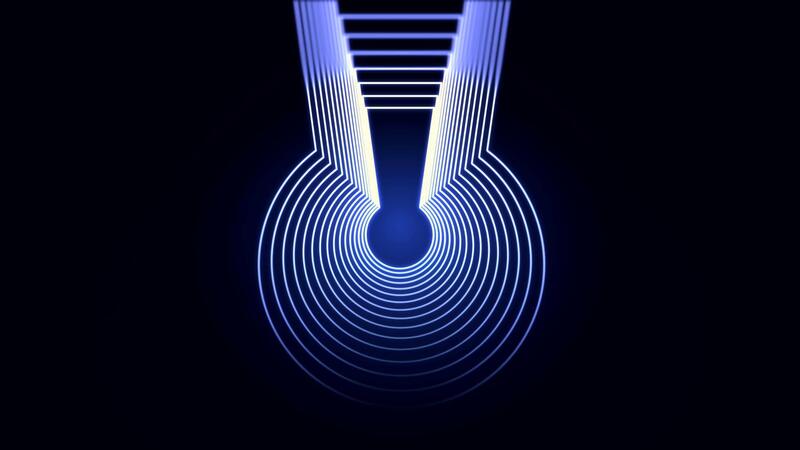 Abstract neon silhouettes of the keyhole of purple color flowing towards the camera isolated on black background. Animation. Colorful glowing lock frames moving one by one, seamless loop. Pro Video
