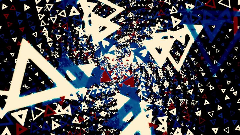Abstract breathtaking psychedelic optical illusion of triangles on black background. Animation. Falling down throung the colorful rotating spiral along vertical 3D rows of figures. Pro Video