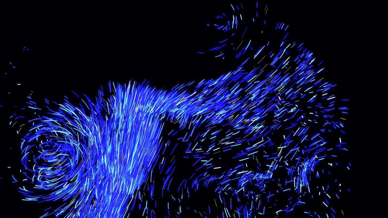 Abstract colorful gentle flow of bended narrow lines over the black background. Animation. Colorful space comet tail moving chaotically. Pro Video