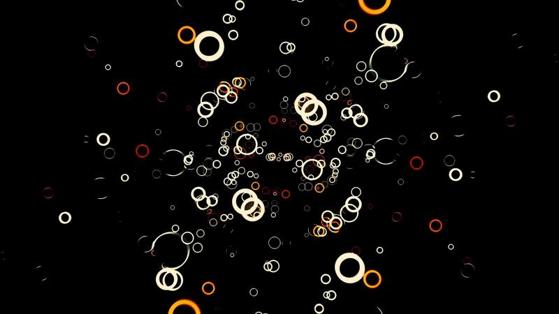 Many small colored circles appear on a dark background and move slowly, seamless loop. Animation. Beautiful yellow and orange rings in 3D motion falling down. Pro Video