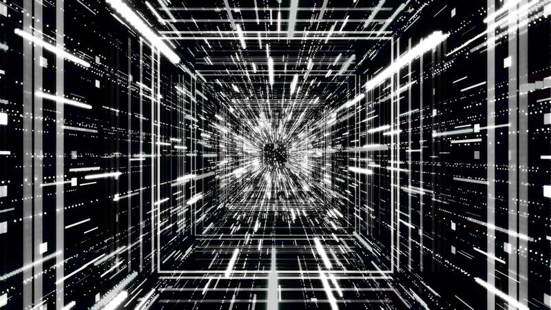 Hyperspace jump through stars, time, and cosmic tunnel, seamless loop. Animation. Abstract flight through 3D futuristic tunnel and flowing bright particles, monochrome. Pro Video