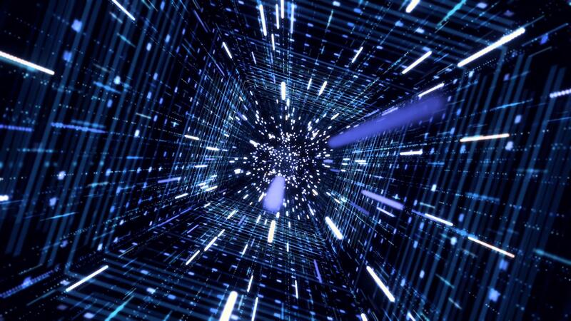 Moving through the abstract blue neon outer space tunnel, seamless loop. Animation. 3D flight inside time machine with the speed of light and stars. Pro Video