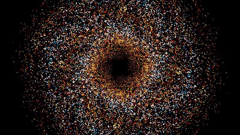 Abstract beatiful relaxing background of orange and red small circles flying and forming a vortex on black background. Animation. Glittering particles resembling space dust, seamless loop. Pro Video