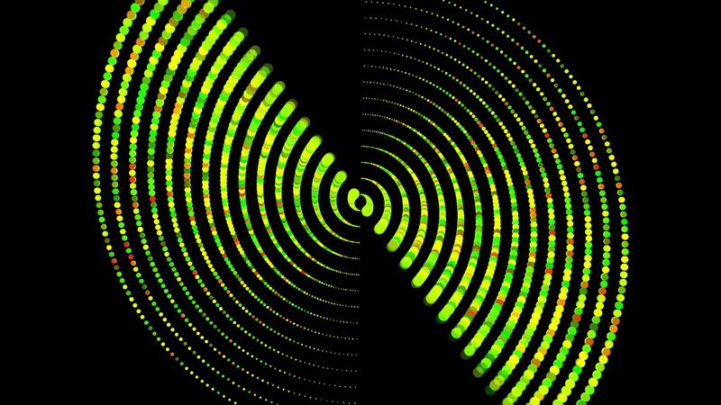 Abstract rows of small circles rotating fast and becoming giant 3D columns on black background. Animation. Psychedelic background with spinning volume shapes. Pro Video
