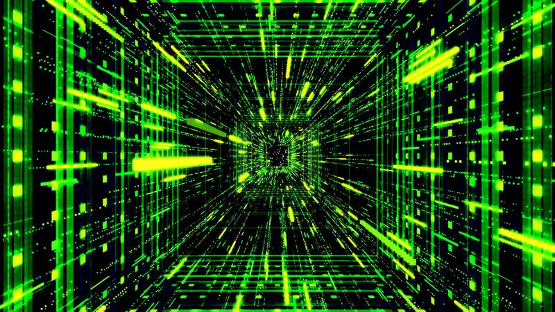Green sci fi tunnel, abstract futuristic technology concept. Animation. 3D journey through cyberspace on black background with matrix effect, seamless loop. Pro Video