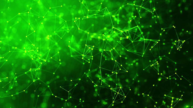 Beautiful background of green connected frames on black background, seamless loop. Animation. Neon glowing green lines and dots flying in the dark. Pro Video