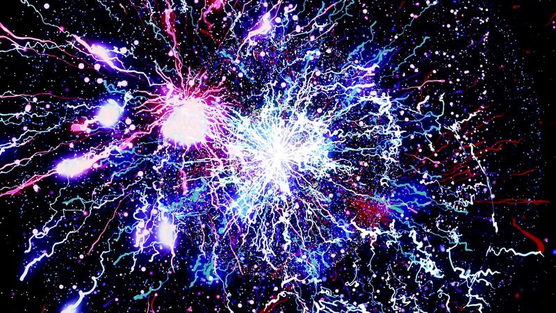 Abstract powerful explosion, energy and colorful impulses on black background, seamless loop. Animation. Mystical light rays in motion all over the screen. Pro Video