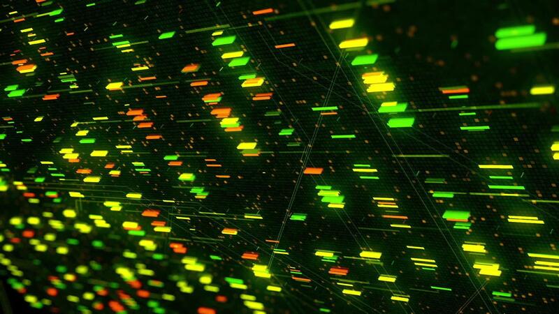 Digital data moving on black background, seamless loop. Animation. Abstract virtual space with 3D flowing blocks of information of green, yellow, and red colors. Pro Video