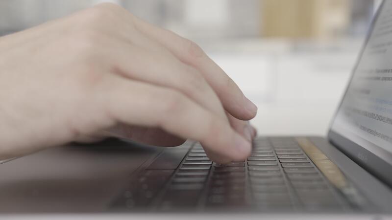 Working at home with laptop, male hands on the keyboard. Action. Close up side view of hands typing on keypad of the computer, concept of modern technologies. Pro Video