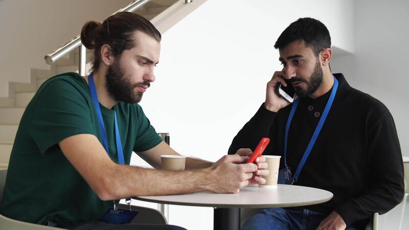 Two businessmen sitting at the table during coffee break and using their smartphones. Media. Young man looking concentrated while browsing browsing on the internet and another guy talking on mobile Pro Video