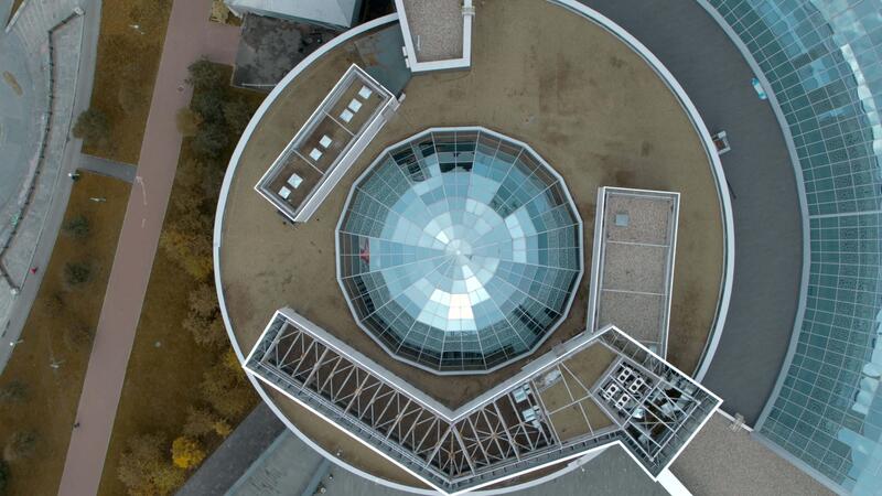 Top view of modern round building with dome. Stock footage. Beautiful architecture of business center with round structure and dome. Rings of building with beautiful facade Pro Video