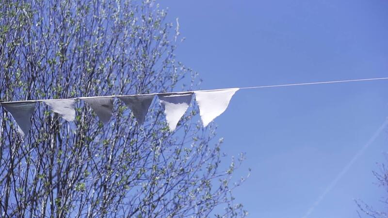 Small triangular flags hanging on a rope and fluttering in the wind. Clip. White flags on the background of bald birch trees and blue sky. Pro Video