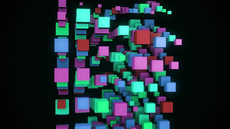 Abstract flowing blue, green, and pink cubes isolated on black background. Animation. Rotating vertical rows of colorful 3D cubes, seamless loop. Pro Video