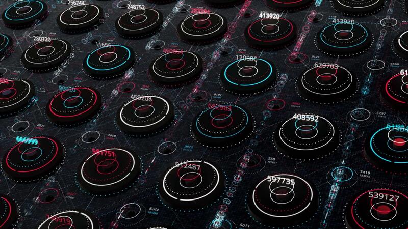 Futuristic technological abstract motion background, seamless loop. Animation. Endless rows of energy rotating same size circles and changing numbers. Pro Video