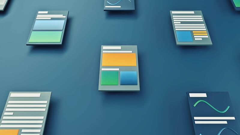 Abstract schematic view of colorful newspapers articles. Animation. Many rows of digital pages with lines and titles. Pro Video