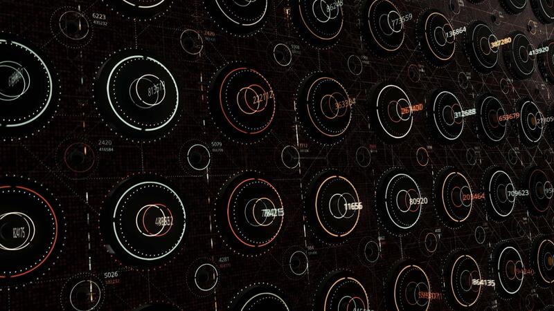 Abstract computer monitor with processing program on black background, seamless loop. Animation. Concept of AI, artificial intelligence. Pro Video