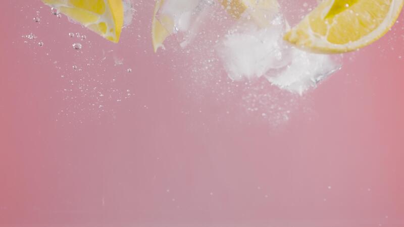Lemon slices with ice fall into water on isolated background. Action. Juicy lemon slices and ice cubes fall into water and float to surface. Refreshing lemon with ice in water Pro Video