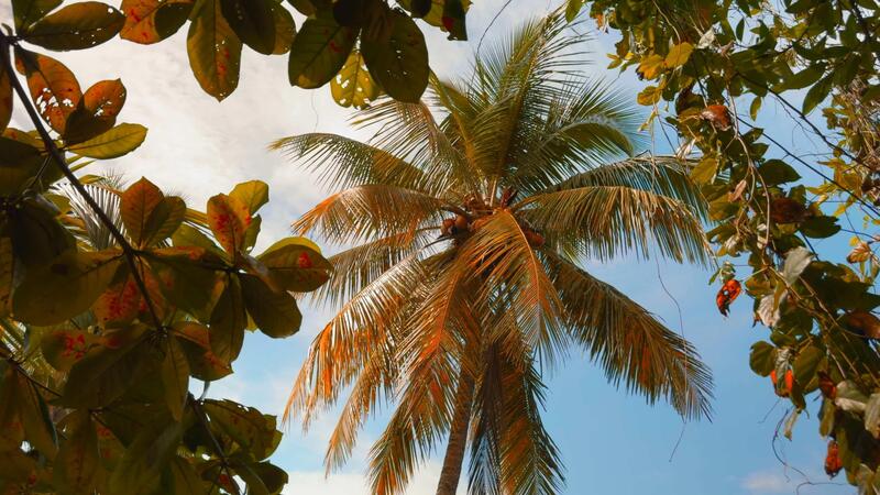 Beautiful view of creative branches of trees and palm tree. Action. Beautiful branches of tropical trees on background of tall palm tree. Beautiful tropical plants and trees with green leaves in Pro Video