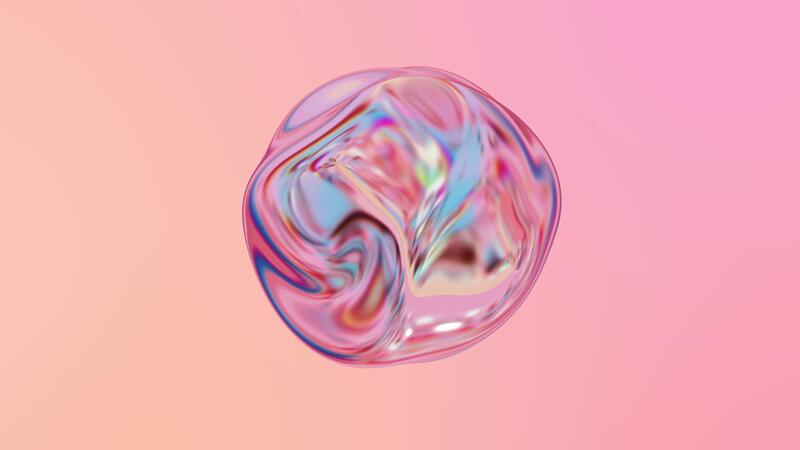 A drop of liquid with a holographic sphere surface. Abstract ball in pink and yellow colors. Seamless time loop. Dynamic transparent moving abstract, modern rainbow round shape. Pro Video