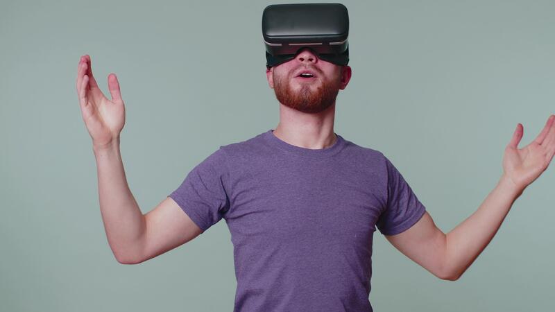 Man using virtual reality futuristic technology VR headset helmet to play simulation 3D video game Pro Video