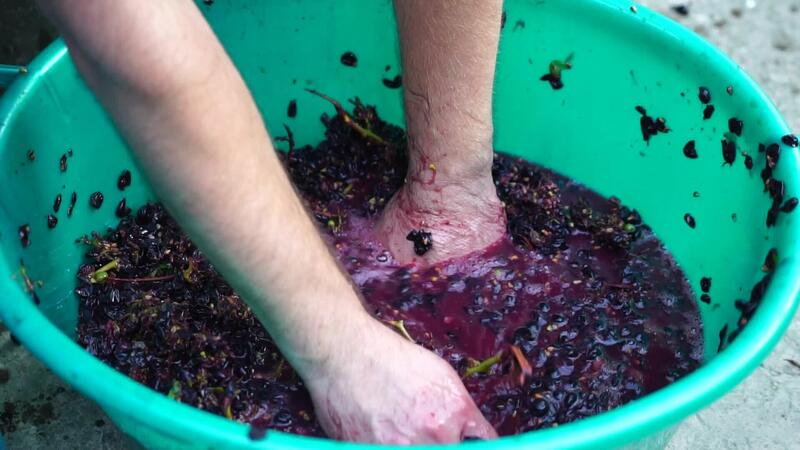 Grape-treading or grape-stomping in traditional winemaking. Senior farmer separates grapes from a bunch in traditional way. Grapes are trampled by barefoot man to release juices and begin fermentation Pro Video