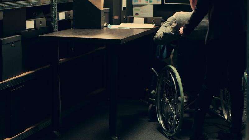 Inspector wheelchair user analyzes geographical maps or data for crime scene reconstructions, helping his colleagues with details in events timeline. Senior detective with disability. Camera A. Pro Video