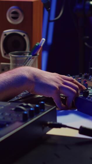 Vertical Video Sound engineer recording and producing audio for music industry, operating on mixing console and daw software in home studio. Musician ensuring optimized acoustics, mastering tracks. Camera A. Pro Video