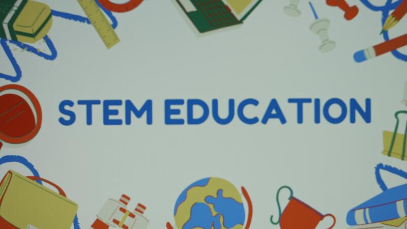 STEM education inscription on background with drawn school supplies. Learning mathematics engineering science technology computer code in robotics. Education concept. Blurred concept. Pro Video