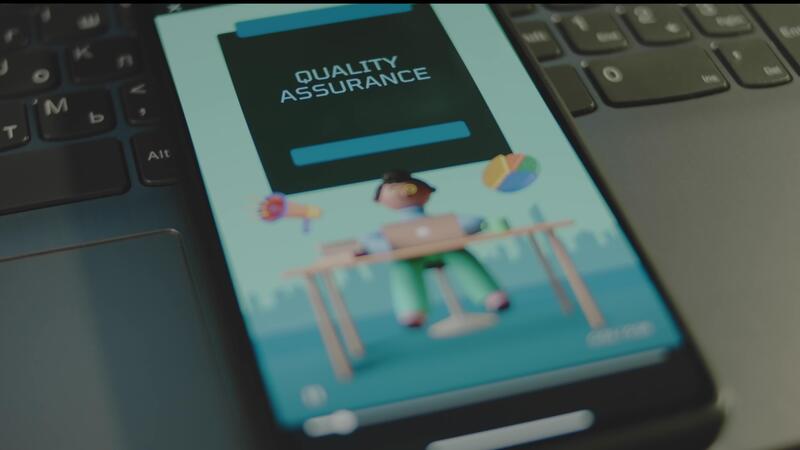 Quality Assurance inscription on smartphone screen. Graphic presentation of factory manager using modern technology to handle the production processes. Manufacturing concept. Light rays Pro Video