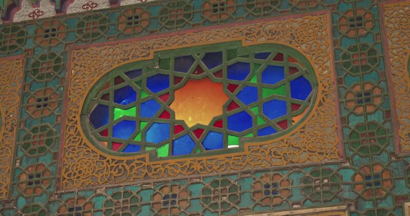 Close-up of patterns and decorative elements of mosaics and windows of the ancient complex Bolo-Khauz. Pro Video