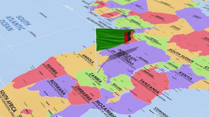 Zambia Flag Waving in Wind, World Map Rotating around Flag, Seamless Loop, 3D Rendering Free Video
