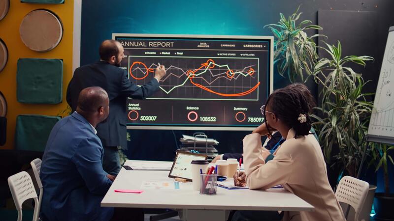 Skilled project team reviewing annual reports market trends in briefing meeting, knowing what to improve in order to guarantee customer experience and satisfaction. Enterprise development. Camera B. Pro Video