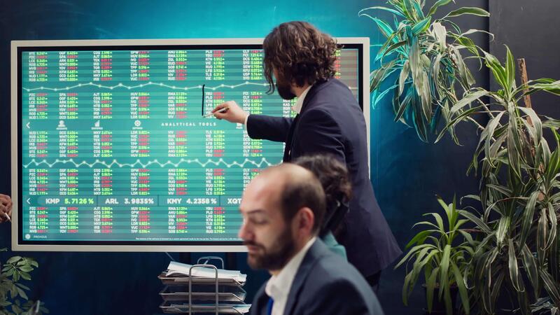 Sales management team reviewing global stock market trends in an informative meeting, extracting capital funds to start development projects. Business colleagues discuss enterprise growth. Camera A. Pro Video