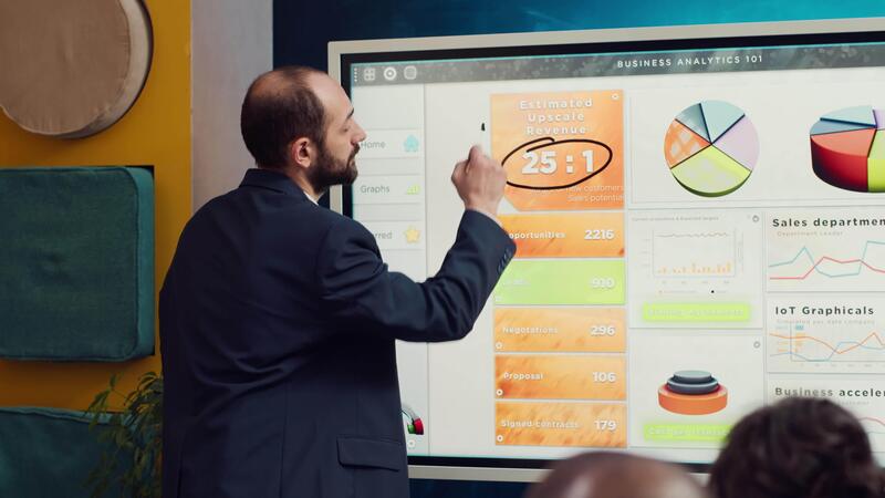 Human resources manager addressing the need of new talent within the business organization, creating a pitch for obtaining new collaborations under signed contracts for development. Camera A. Pro Video