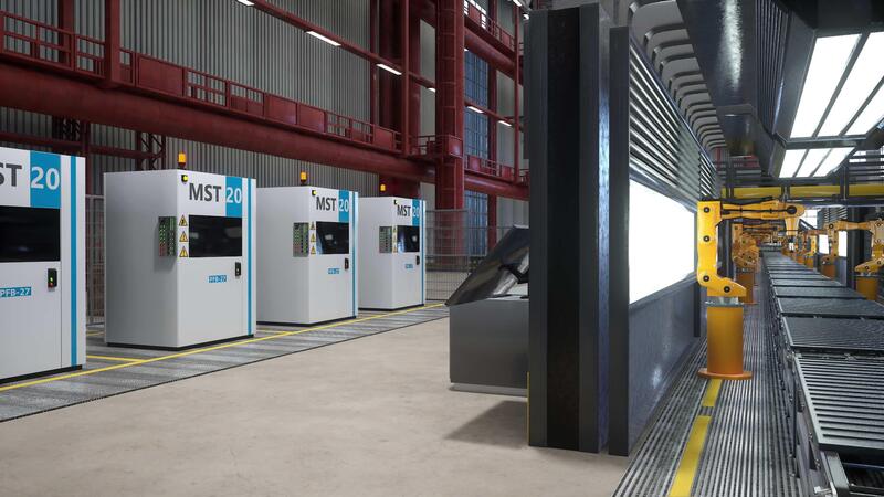 Industrial robot arms working on assembly line in factory next to computerized machines, 3D render. Heavy machinery units being used on conveyor belts in automated warehouse with hardware equipment Pro Video