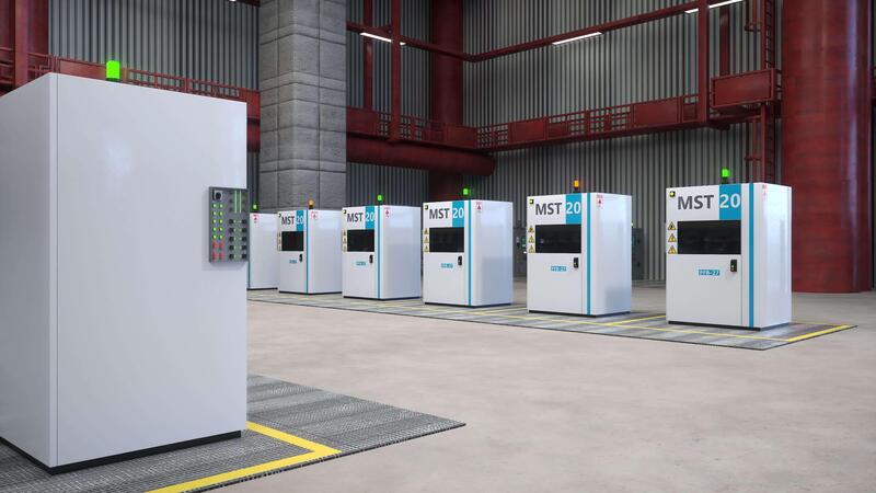 Industrial facility showcasing rows of high tech machines with control panels and safety signs, 3D rendering. Hardware equipment in automated warehouse prioritizing energy efficiency Pro Video