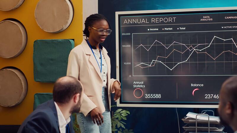 Business employee doing a presentation with project updates and timelines to ensure progress, explaining allocated resources and strategic objectives. Coworkers attend a briefing meeting. Camera A. Pro Video