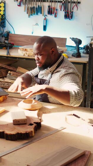 Vertical Carpenter looking over blueprints schematics on laptop in CAD software with apprentice. Woodworkers designing custom 3D furniture on notebook in studio, preparing for client order, camera B Pro Video