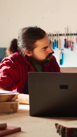 Vertical Woodworkers using CAD software on laptop to design wooden objects, pointing towards screen. Carpenters using program on notebook to help them do furniture assembling in joinery, camera B Pro Video