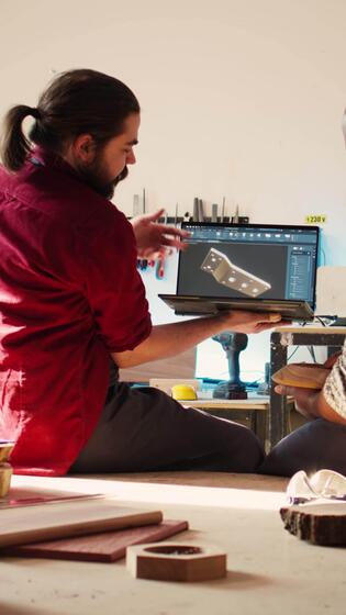 Vertical Woodworker looking over blueprints on laptop in CAD software with apprentice. Manufacturer and coworker designing custom 3D furniture on notebook in studio, preparing for customer order, camera B Pro Video