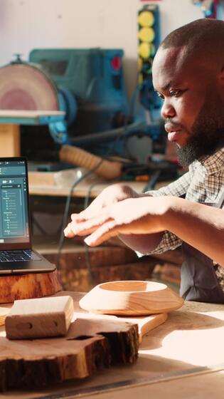Vertical Carpenter looking over blueprints schematics on laptop in CAD software with apprentice. Woodworkers designing custom 3D furniture on notebook in studio, preparing for client order, camera A Pro Video