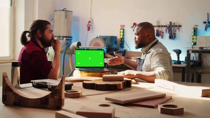 Woodworker looking over blueprints on green screen laptop in CAD software with apprentice. Craftsperson and coworker designing custom 3D furniture on chroma key notebook in studio, camera B Pro Video