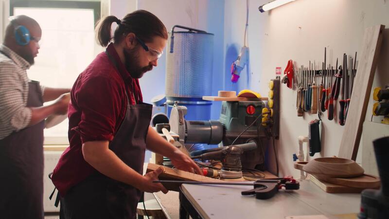Woodworker using bench vise to hold lumber block, starting furniture assembling in workshop. Craftsperson in joinery using vice tool to clamp piece of wood before carving it, camera B Pro Video