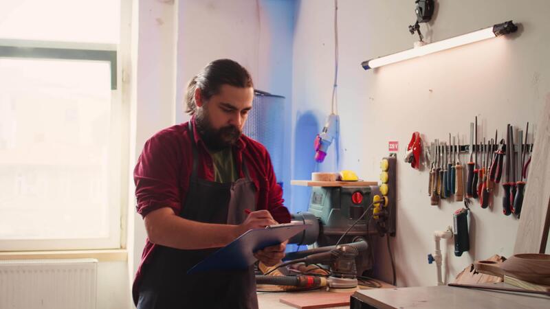 Woodworker looking over blueprints on laptop, brainstorming with colleague next steps in wood processing. Manufacturer and BIPOC apprentice reading furniture assembly schematics in studio, camera B Pro Video