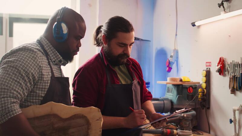 Carpenter and colleague looking over technical schematics, brainstorming ideas for wooden object. Master and apprentice analyzing blueprints to execute furniture assembling project, camera B Pro Video