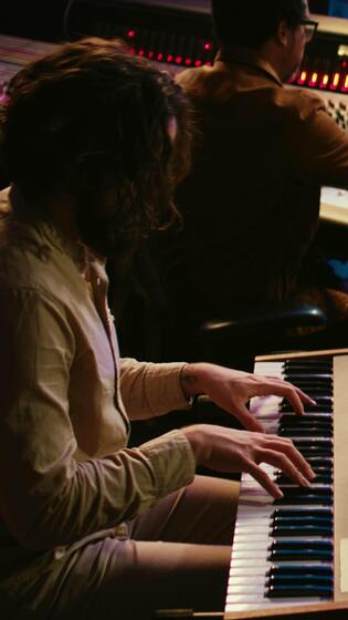 Vertical Skilled artist singer recording songs on electronic midi controller, singing on piano and creating tracks with audio engineer. Young musician composer editing music on console. Camera B. Pro Video